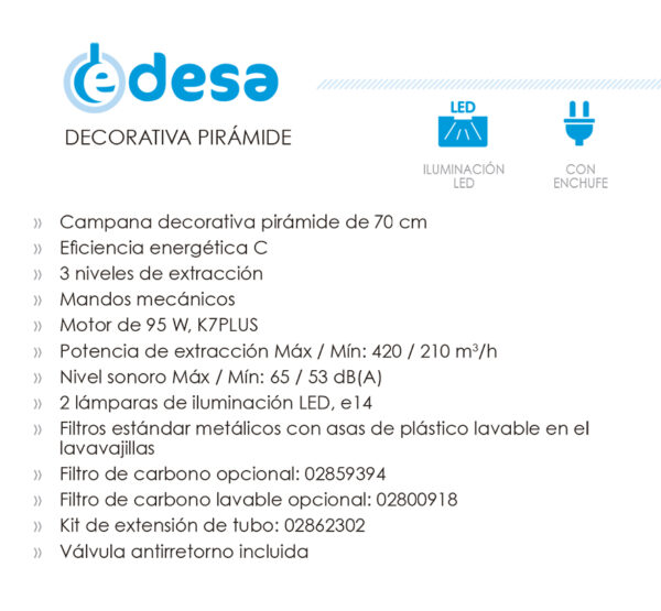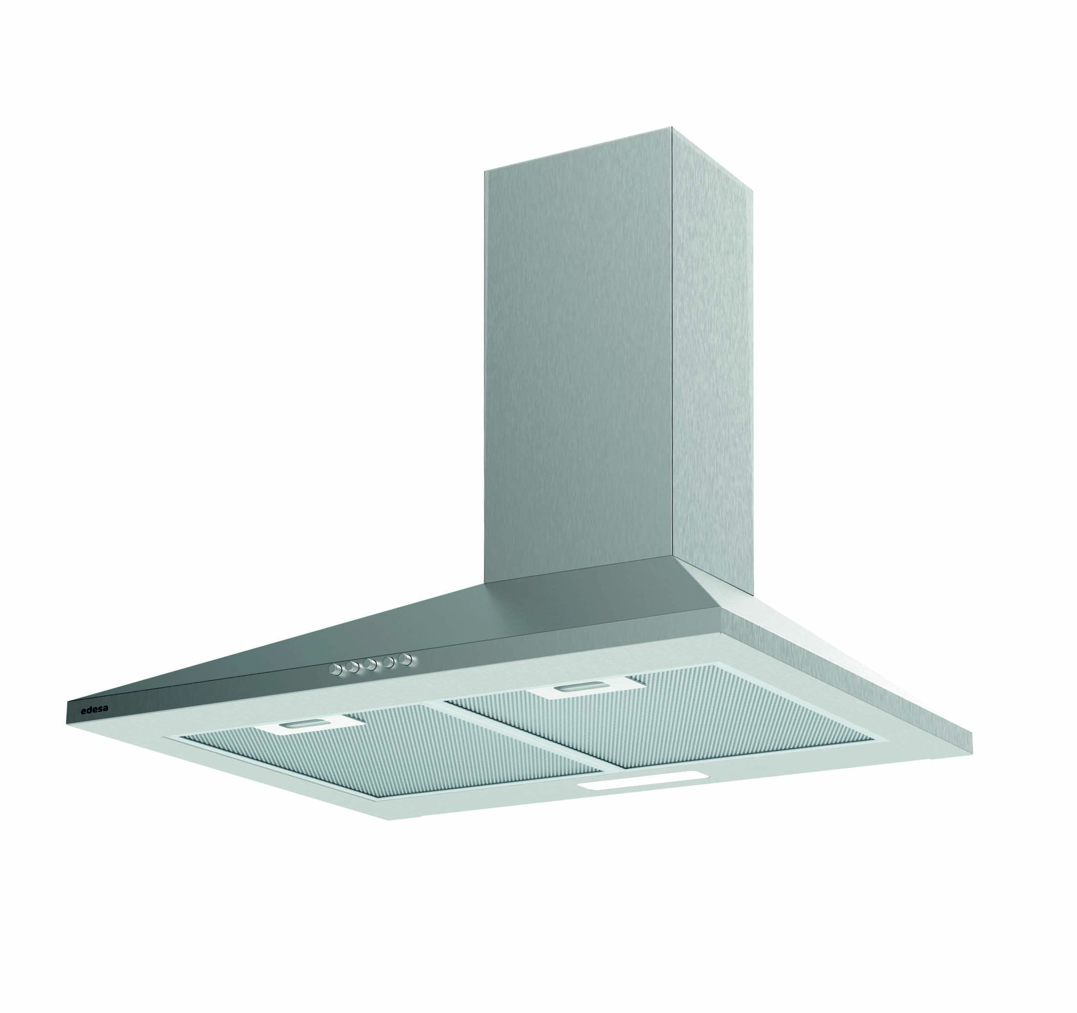 La Edesa ECP-74110 X es una campana decorativa en acero inoxidable de 70 cm, diseñada para aportar estilo, eficacia y comodidad a tu cocina. Ofrece una extracción potente de más de 477 m³/h (clase energética A), con tres niveles de potencia manejados por botones mecánicos, que eliminan los humos y olores de forma eficiente.