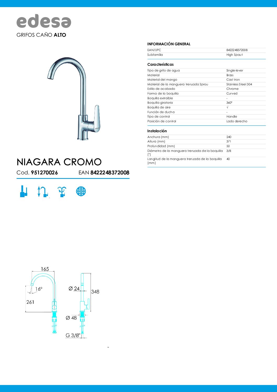 El Cata Niagara es un grifo monomando de caño alto con cuerpo de latón cromado que combina diseño moderno y funcionalidad. Está equipado con un cartucho cerámico resistente y un aireador antical que limita el caudal a 5,7 l/min, lo que ayuda a ahorrar agua sin sacrificar confort.