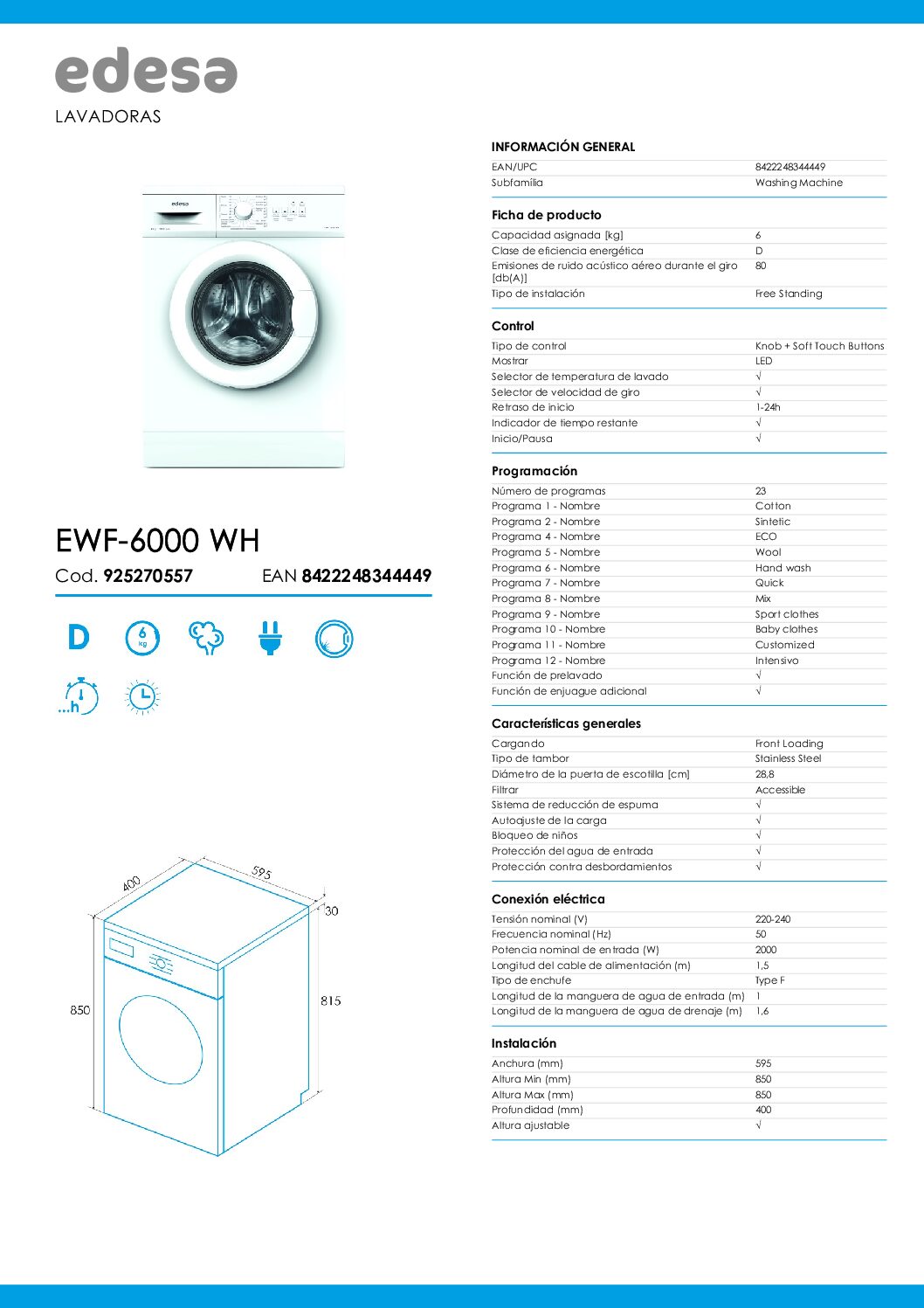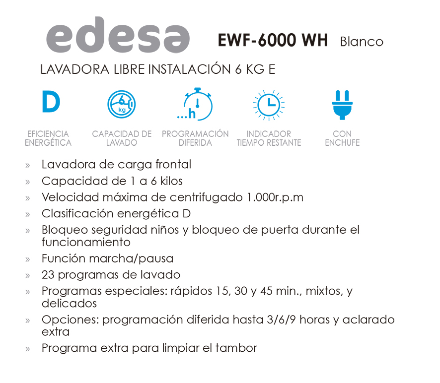 La Edesa EWF‑6000 WH es una lavadora de 6 kg de carga frontal en acabado blanco, con diseño funcional y tecnología fácil de usar. Dispone de 23 programas de lavado, incluyendo opciones específicas como Quick