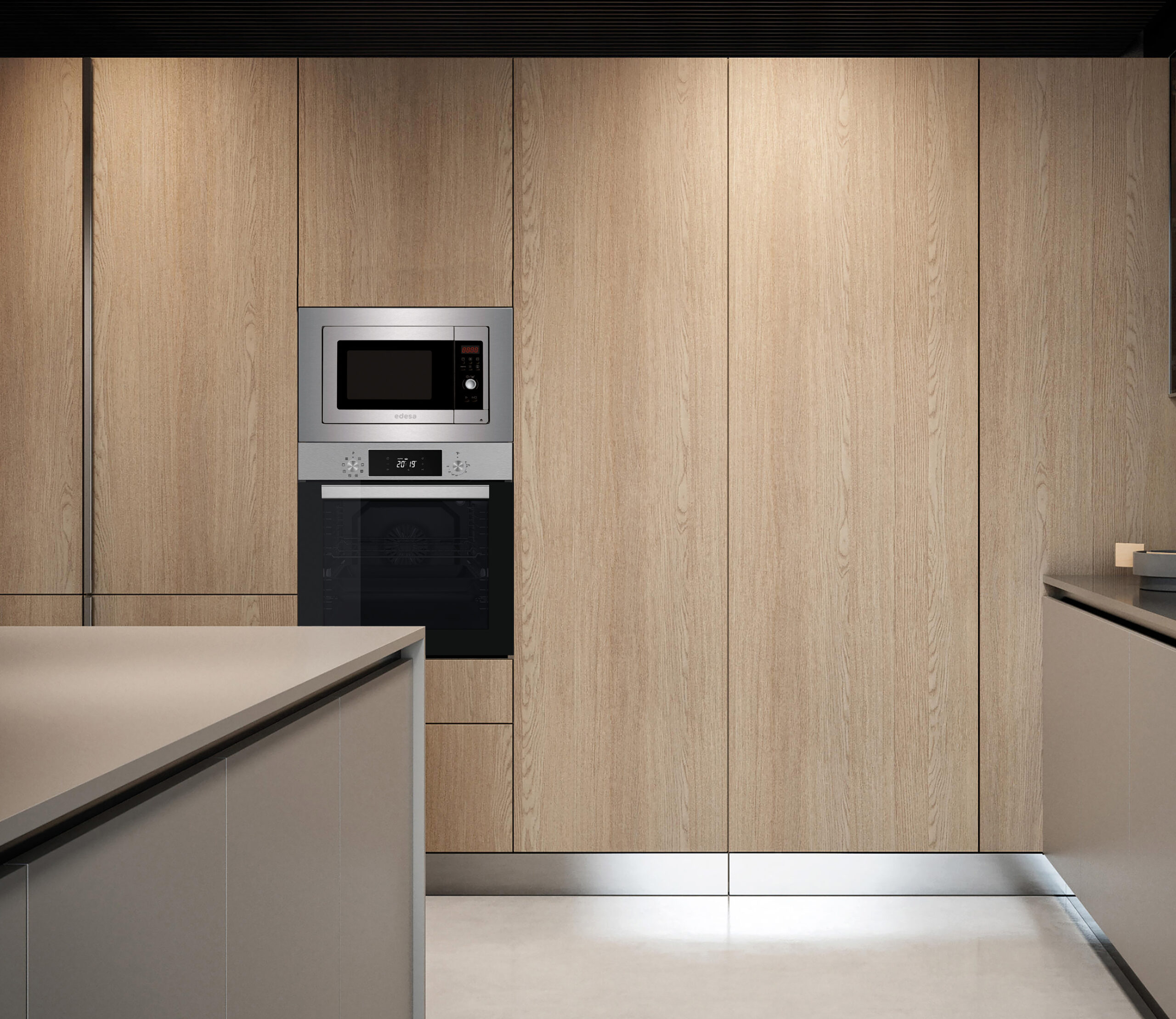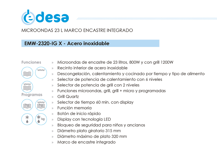 Este microondas de encastre de 23 litros combina funcionalidad y diseño elegante en acero inoxidable. Su panel electrónico con display LED y botón Push para abrir la puerta lo hacen cómodo de utilizar.